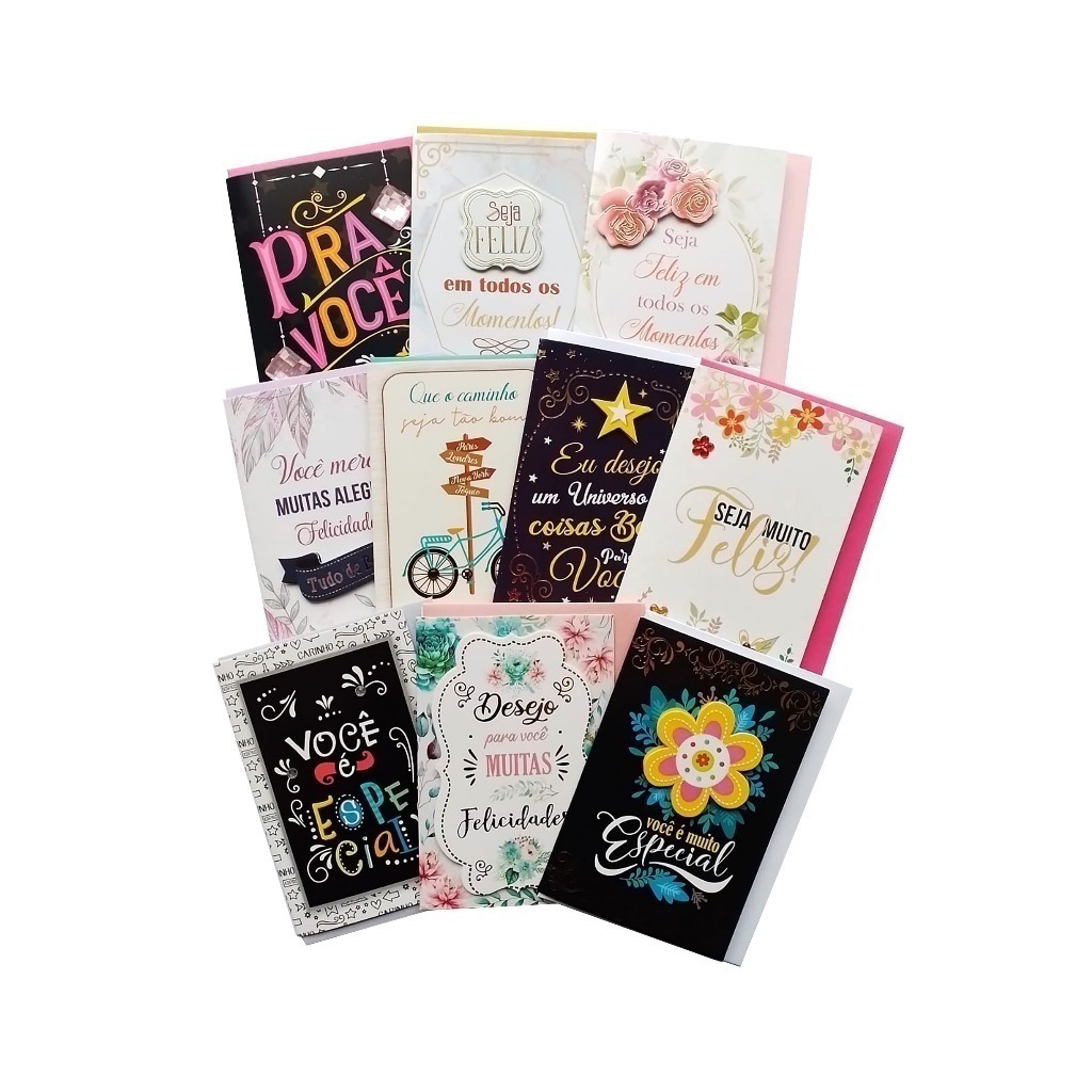Kit 10 Cartões Sortidos de Felicitações Pessoas Queridas 7,5x11,0cm com Envelope, Agência de Ideias. O kit contém: 10 Cartões Sortidos de Felicitações Pessoas Queridas da melhor qualidade, com envelope colorido, acabamento em HotStamping e embalados individualmente para maior durabilidade. *Os Kits são montados conforme a disponibilidade em estoque. INFORMAÇÕES TÉCNICAS Papel Supremo 250 g/m². Envelope Papel Off-set 90 g/m². Tamanho: 7,5 x 11,0cm. Obs.: Imagens Ilustrativas, as cores podem sofrer pequenas variações conforme a sua tela/monitor.