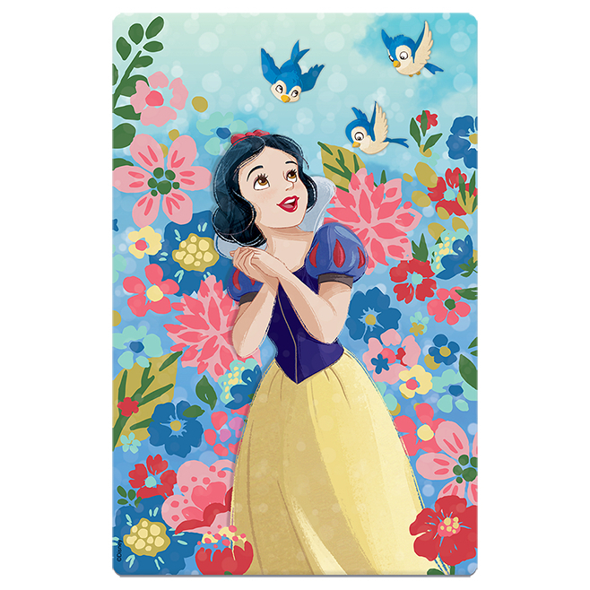 Tema: A ilustração retrata a adorada princesa da Disney Branca de Neve na floresta com flores e pássaros que a cercam. A cena é cheia de detalhes e cores, estimulando a percepção visual e a atenção.