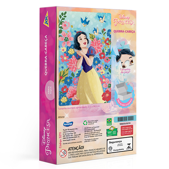 O quebra-cabeça da Toyster é certificado por órgãos de segurança, garantindo que o produto é seguro para a idade recomendada. É uma opção popular e acessível para presentear crianças que gostam da Branca de Neve e de jogos de encaixar.